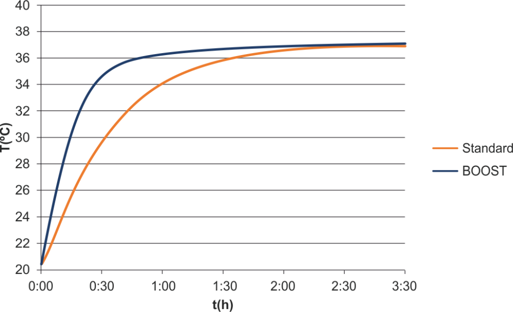 BOOST mode can be selected to reach incubation temperature of culture media up to 45% faster.